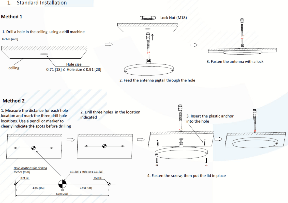 | Mounting/Connector type | Ceil Mount IXL-SQA-H6U; 4.3-10 Female, IXL-SQN-H6U; N-Female |