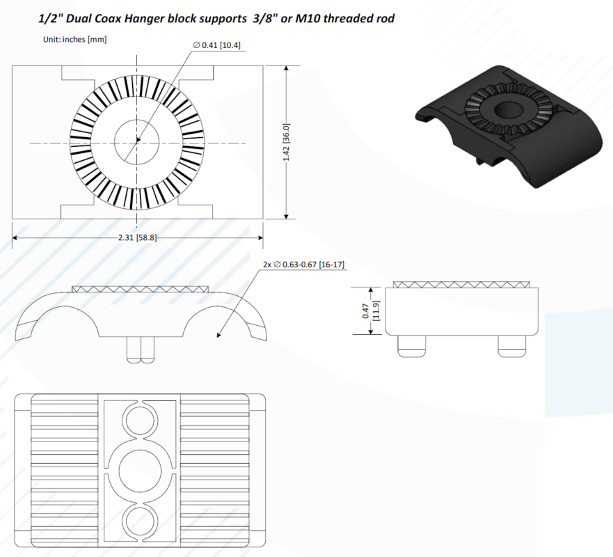 1/2” Dual Coax Hanger Block for 3/8” or M10 threaded rod