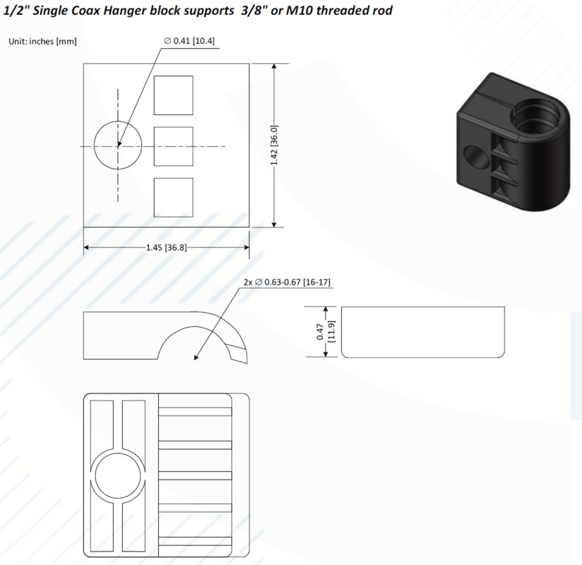 1/2” Single Coax Hanger Block for 3/8” or M10 threaded rod